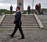 Председатель правительства России Дмитрий Медведев во время церемонии возложения венков к памятнику советскому Воину-освободителю в Киркенесе.