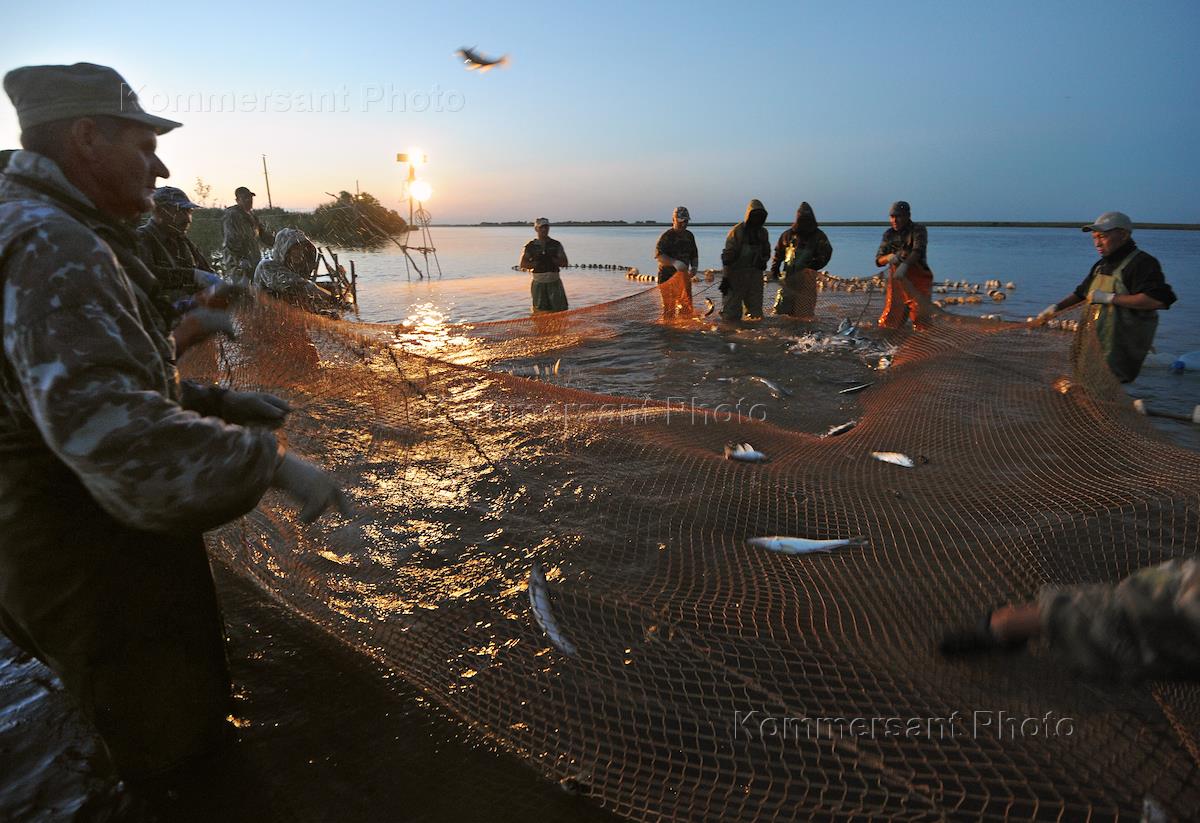 Сотрудники рыболовецкой артели вытягивают сети с рыбой.