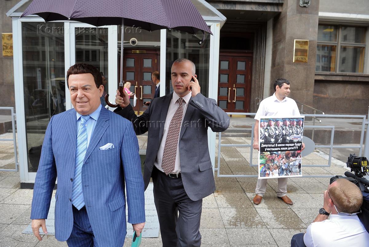 Член комитета Государственной думы (ГД) России по культуре Иосиф Кобзон (слева) у входа в здание Государственной думы России.