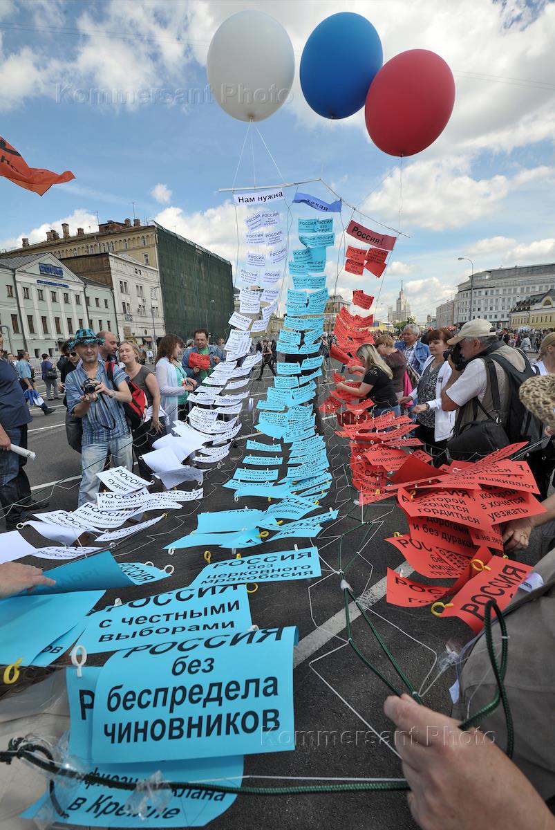Акция оппозиции "Марш против палачей" во время шествия от Калужской площади до Болотной. Листовки с надписью "Россия без пределов чиновников", "Россия с честными выборами".