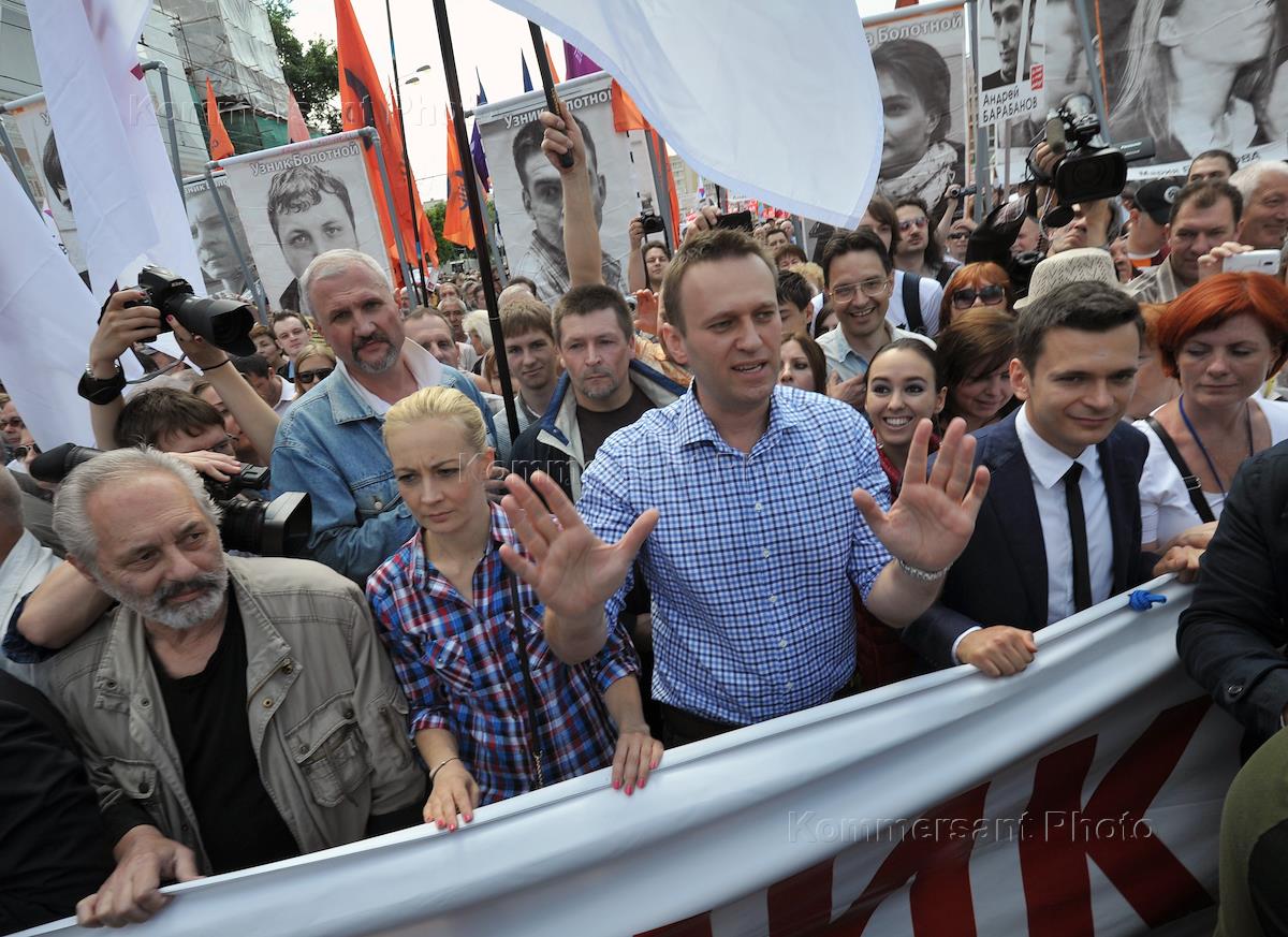 Акция оппозиции "Марш против палачей" прошла от Калужской площади до Болотной. Председатель Координационного совета оппозиции (КСО) Алексей Навальный (в центре) во время акции.