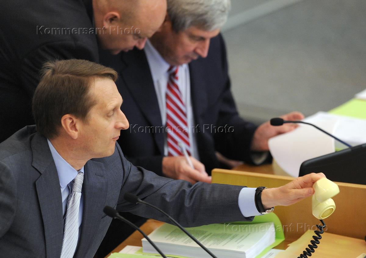 Chairman of the Russian State Duma Sergei Naryshkin (left) at the plenary session of the State Duma.