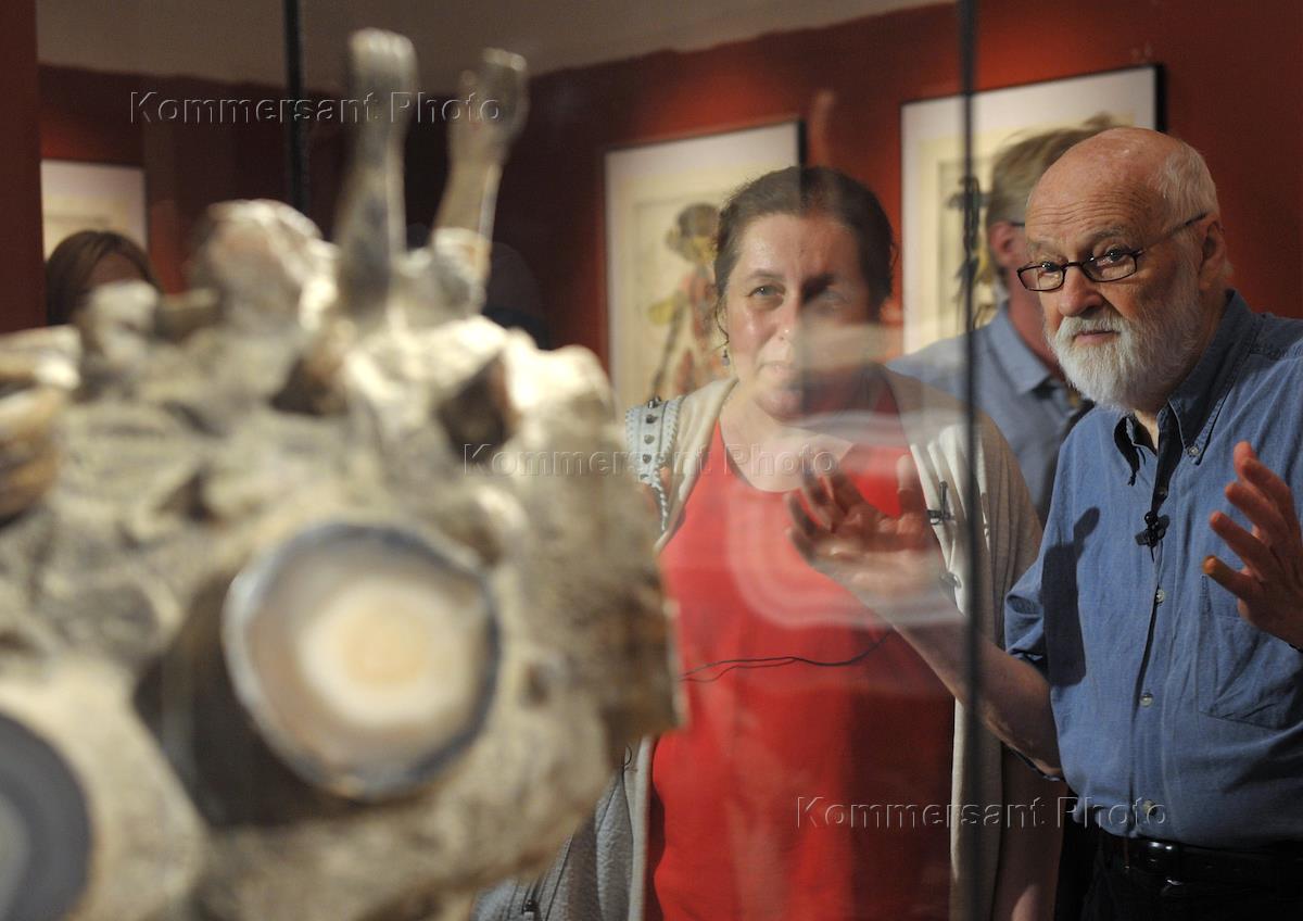 Чешский кинорежиссер, сценарист, художник, сценограф, скульптор, аниматор Ян Шванкмайер (справа) на церемонии открытия своей выставки, посвященной анимации, "Кунсткамера Яна Шванкмайера" в павильоне Центра "Гараж" в Центральном парке культуры и отдыха имени Горького.