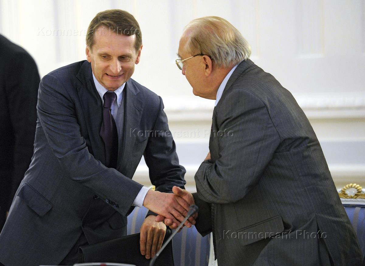 Писатель, драматург Эдвард Радзинский (слева) во время встречи председателя Государственной думы России Сергея Нарышкина (справа) с историками и общественными деятелями, посвященная годовщине воссоздания Российского исторического общества.