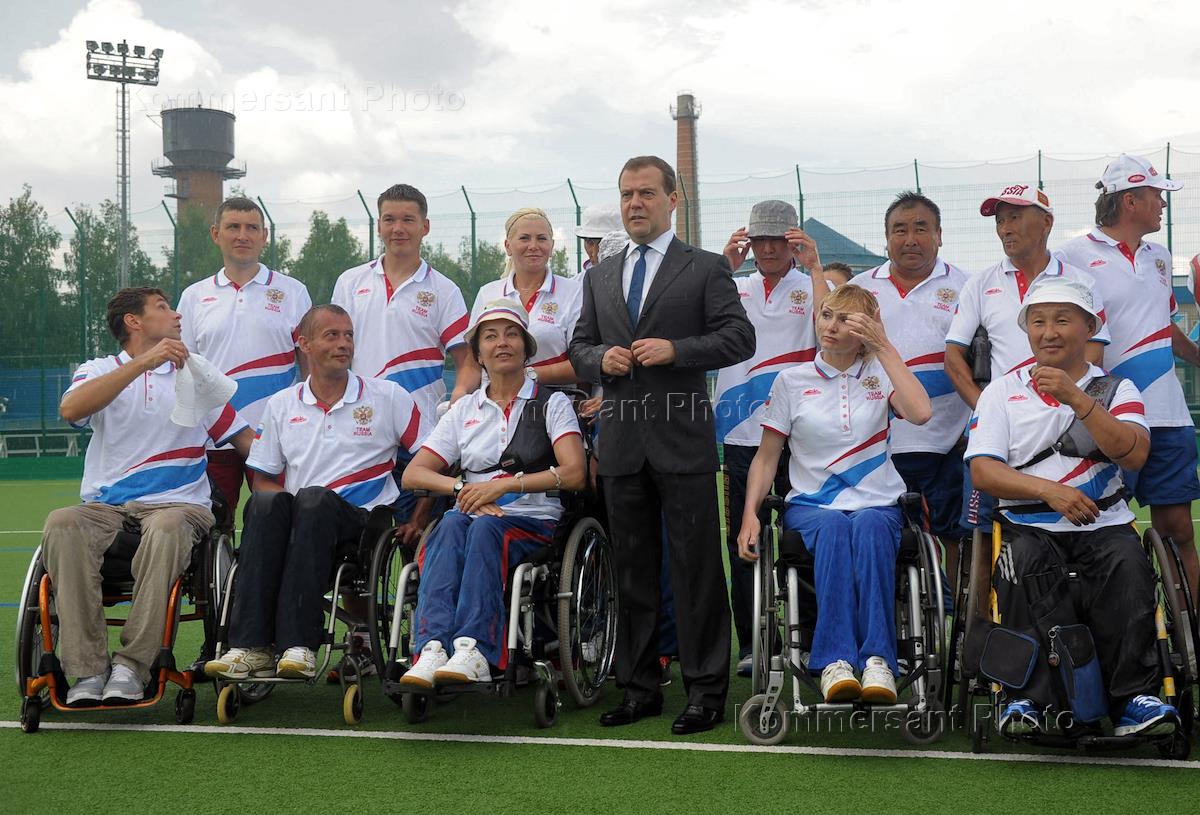 Председатель правительства России Дмитрий Медведева (в центре) во время тренировки паралимпийской сборной России по стрельбе из лука в Республиканской учебно-тренировочной базе "Ока" в Тульской области.