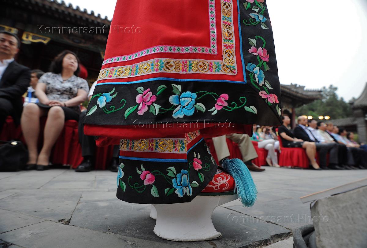 Genre photo. Chinese girls in traditional costumes during the tea ceremony.