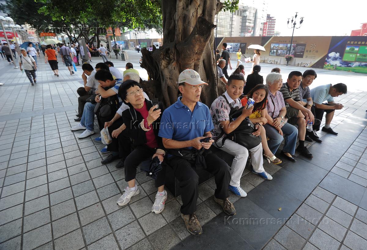Виды Китая. Туристы во время отдыха в парке на скамейке.
