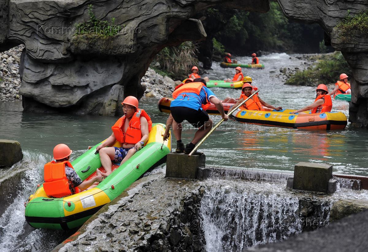 Виды Китая. Туристы во время сплава по реке на надувных лодках.