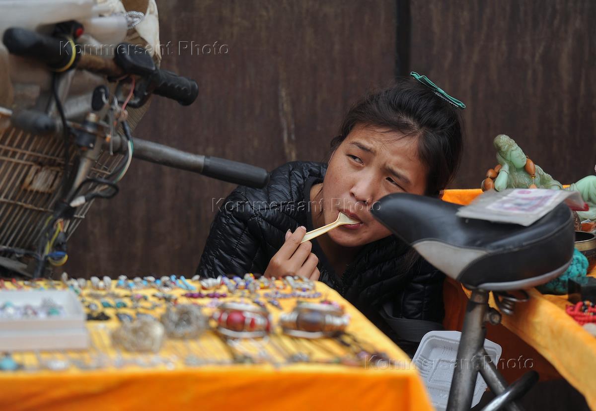 Shoppers in a street bookstall. Literature with a portrait of Chinese Communist leader Mao Zedong.