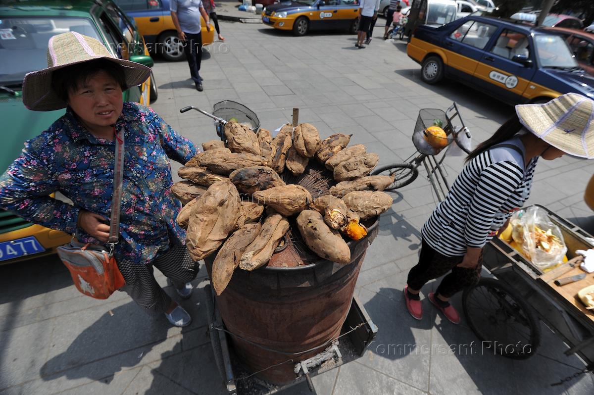 Shoppers in a street bookstall. Literature with a portrait of Chinese Communist leader Mao Zedong.