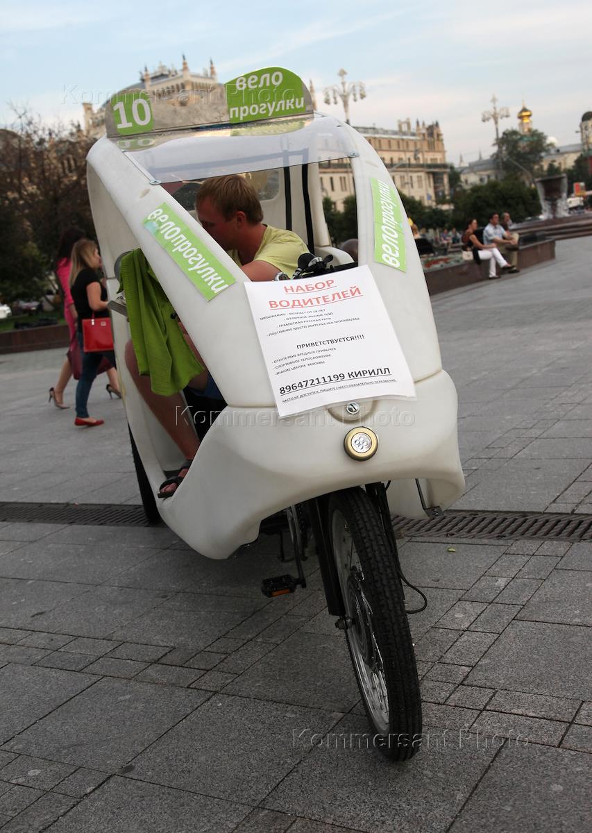Жанрова фотография. Велотакси с рекламой туристической услуги "Велопрогулки" и объявлением о наборе водителей. Манежная площадь.