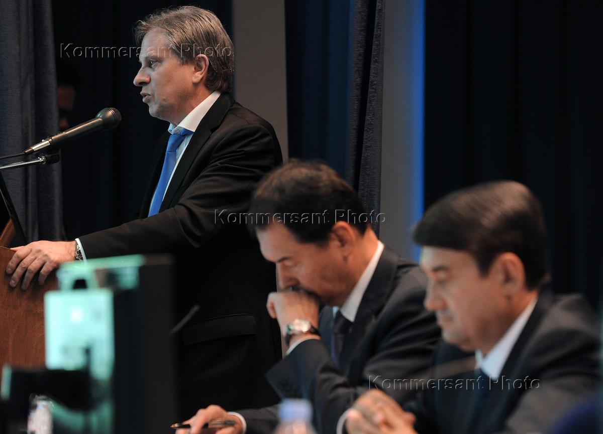 From left to right: Deputy Minister of Transport of Russia Valery Okulov, adviser of the Russian president Igor Levitin and Deputy Chairman of the Russian State Duma (SD) Sergei Neverov during a visiting session of the State Duma Committee on Economic Policy, Entrepreneurship and Innovation Development and Transport. The meeting was devoted to the problems of the development domestic passenger air transportation market, held in the office complex Aeroflot "Melkisarovo - Sheremetyevo".
