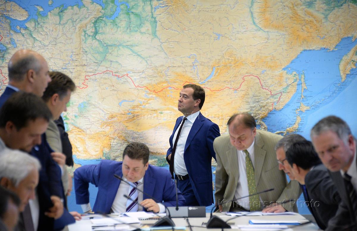 Председатель правительства России Дмитрий Медведев (в центре) во время заседания президиума Совета при президенте России по модернизации экономики и инновационному развитию России.