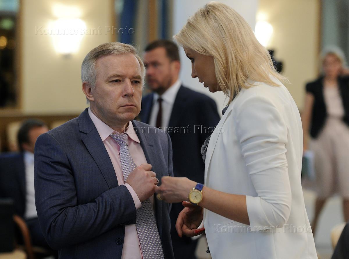 Заместитель руководителя аппарата Государственной думы (ГД) России - начальник управления по связям с общественностью и взаимодействия со СМИ Юрий Шувалов (слева) и член Центрального совета, координатор по взаимодействию с органами государственной власти политической партии "Российская экологическая партия "Зеленые" Елена Гришина (справа) во время заседания Совета непарламентских партий при председателе ГД, посвященного вопросам развития пенсионной системы. Заседание прошло в здании ГД.