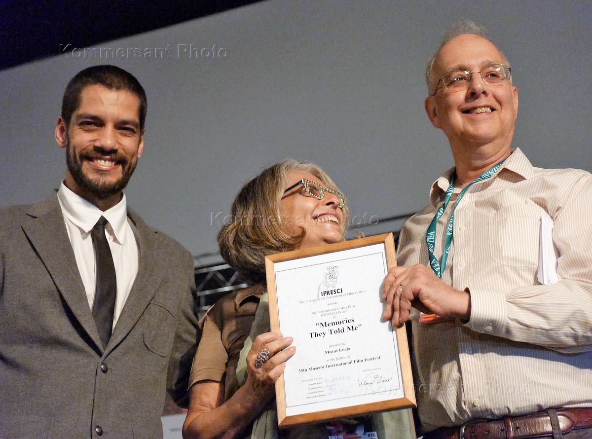 XXXV Московский международный кинофестиваль (ММКФ). Режиссер (Бразилия) Люсия Мурат (в центре) и американский кинокритик Джеральд М. Пири (справа) на пресс-конференции, где были названы первые лауреаты смотра. Пресс-конференция прошла в пресс-центре фестиваля в Государственном театре киноактера.