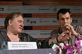 Французский актер с российским гражданством Жерар Депардье (слева) и режиссер Филипп Янковский (справа) на пресс-конференции, посвященной фильму закрытия 35-го Московского международного кинофестиваля "Распутин". Пресс-конференция прошла в Государственном театре киноактера.