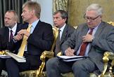 Заместитель руководителя администрации президента России, пресс-секретарь президента Дмитрий Песков (второй слева) и президент, председатель правления ОАО "НК "Роснефть" Игорь Сечин (второй справа) на встрече президента России Владимира Путина и президента Венесуэлы Николаса Мадуро. Встреча прошла в Кремле.