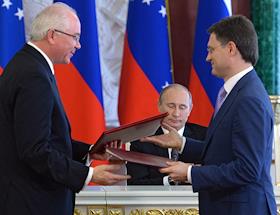 Слева направо: министр нефти Венесуэлы, президент PDVSA Рафаэль Рамирес, президент России Владимир Путин и министр энергетики России Александр Новак на церемонии подписанния документов по итогам российско-венесуэльских переговоров.