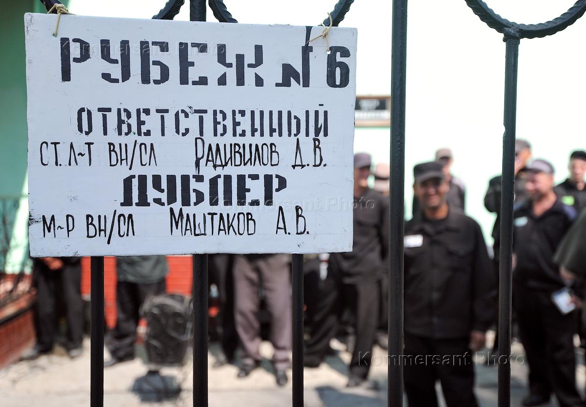 Исправительная колония строгого режима № 7 ("Тюрьма нового типа"). Заключенные во время прогулки. Табличка на заборе с надписью "Рубеж № 6 ответсвенный старший летенант внутренней службы Радивилов Д.В".