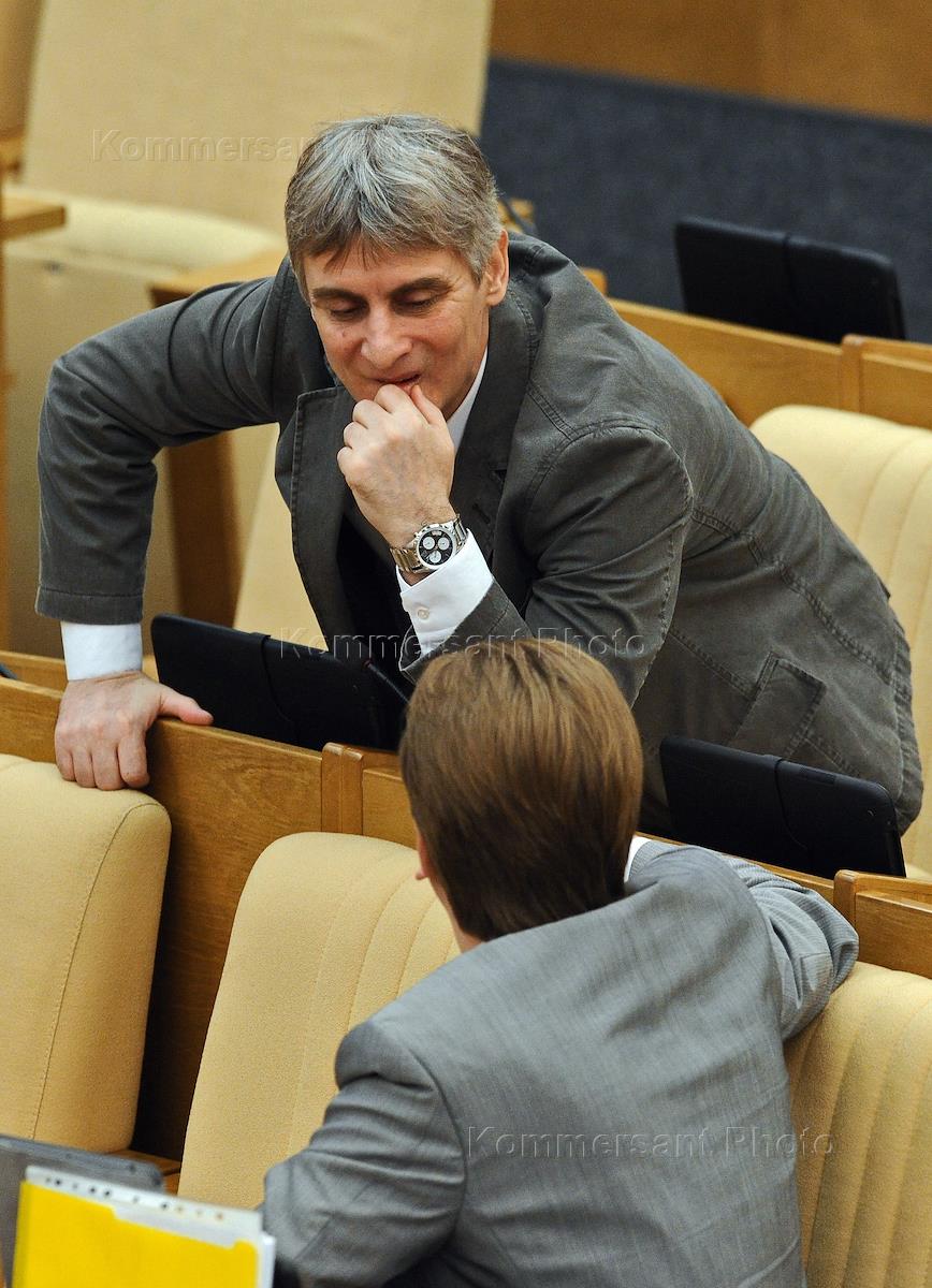 Первый заместитель председателя комитета Государственой думы России по конституционному законодательству и государственному строительству Вячеслав Лысаков (слева) на пленарном заседании Госдумы.