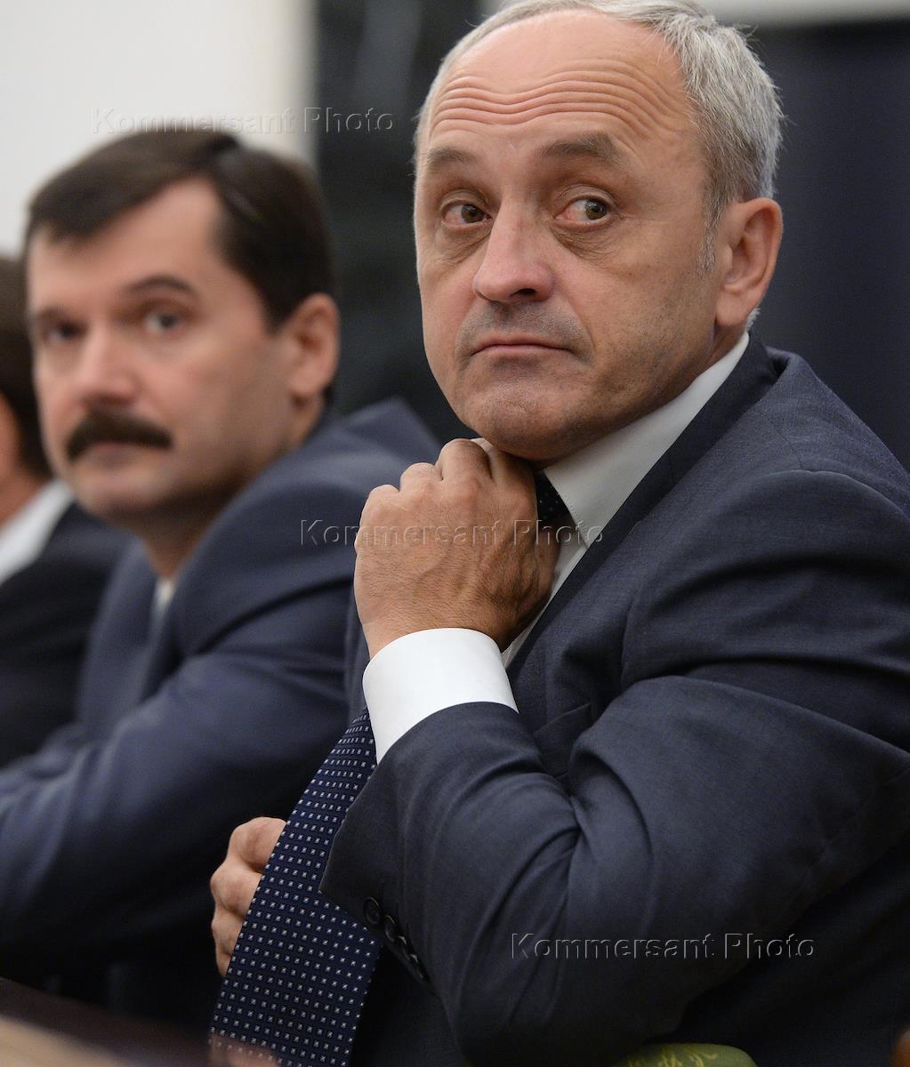Acting governor of the Moscow region Andrei Vorobyov (left) and Advisor to the Russian President Igor Levitin (right) during the meeting "About the Development of Moscow airports" in the Kremlin.