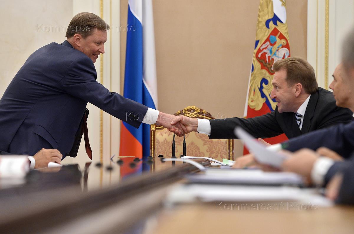 First Deputy Prime Minister of Russia Igor Shuvalov (left) and Finance Minister Anton Siluanov (right) during the meeting "About the Development of Moscow airports" in the Kremlin.