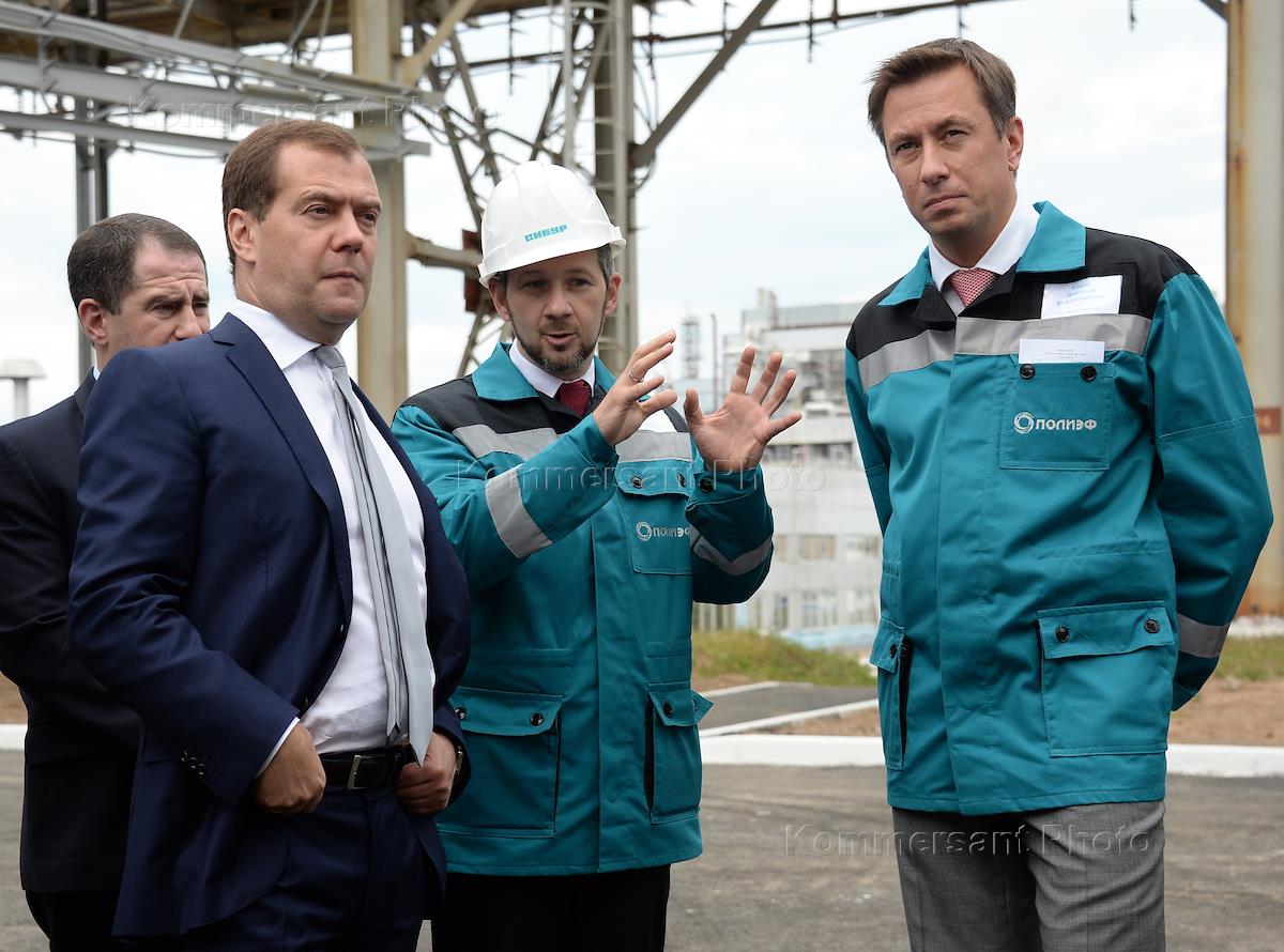 Генеральный директор ОАО "Газпром нефть", заместитель председателя совета директоров ОАО "Сибур Холдинг" Александр Дюков(слева), председатель правительства России Дмитрий Медведев (cлева третий), председатель правления ОАО "СИБУР Холдинг" Дмитрий Конов (в центре) на предприятии ОАО "ПОЛИЭФ" компании "Сибур-ПЭТФ" в Благовещенске.