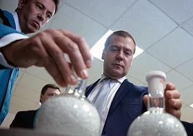Председатель правительства России Дмитрий Медведев на предприятии ОАО "ПОЛИЭФ" компании "Сибур-ПЭТФ" в Благовещенске.