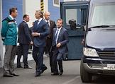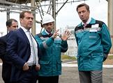 Министр энергетики России Александр Новак (слева), председатель правительства России Дмитрий Медведев (второй справа) и полномочный представитель президента России в Приволжском федеральном округе Михаил Бабич (справа) на предприятии ОАО "ПОЛИЭФ" компании "Сибур-ПЭТФ" в Благовещенске.