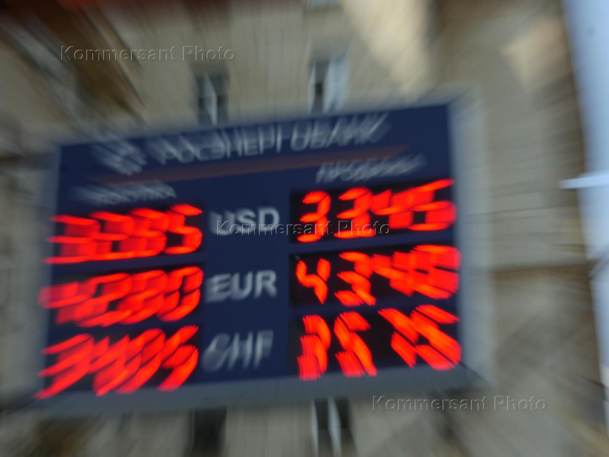 Жанровая фотография. Электронное информационное табло обменного пункта валюты с курсом доллара выше 33 рублей.