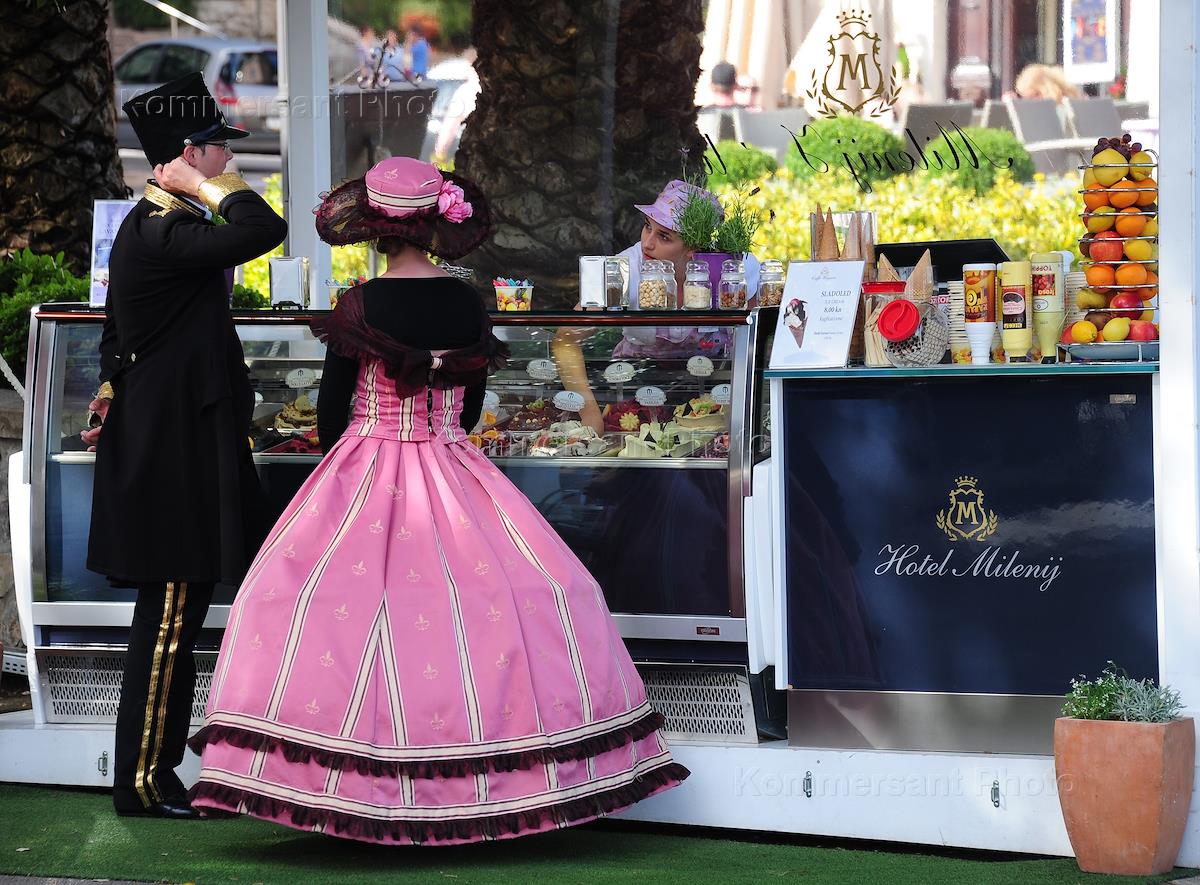 Пара в костюмах XIX века у киоска с мороженым в городе-курорте Опатия.