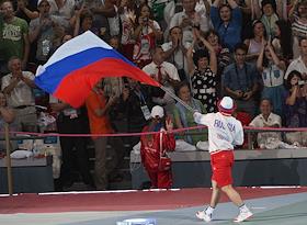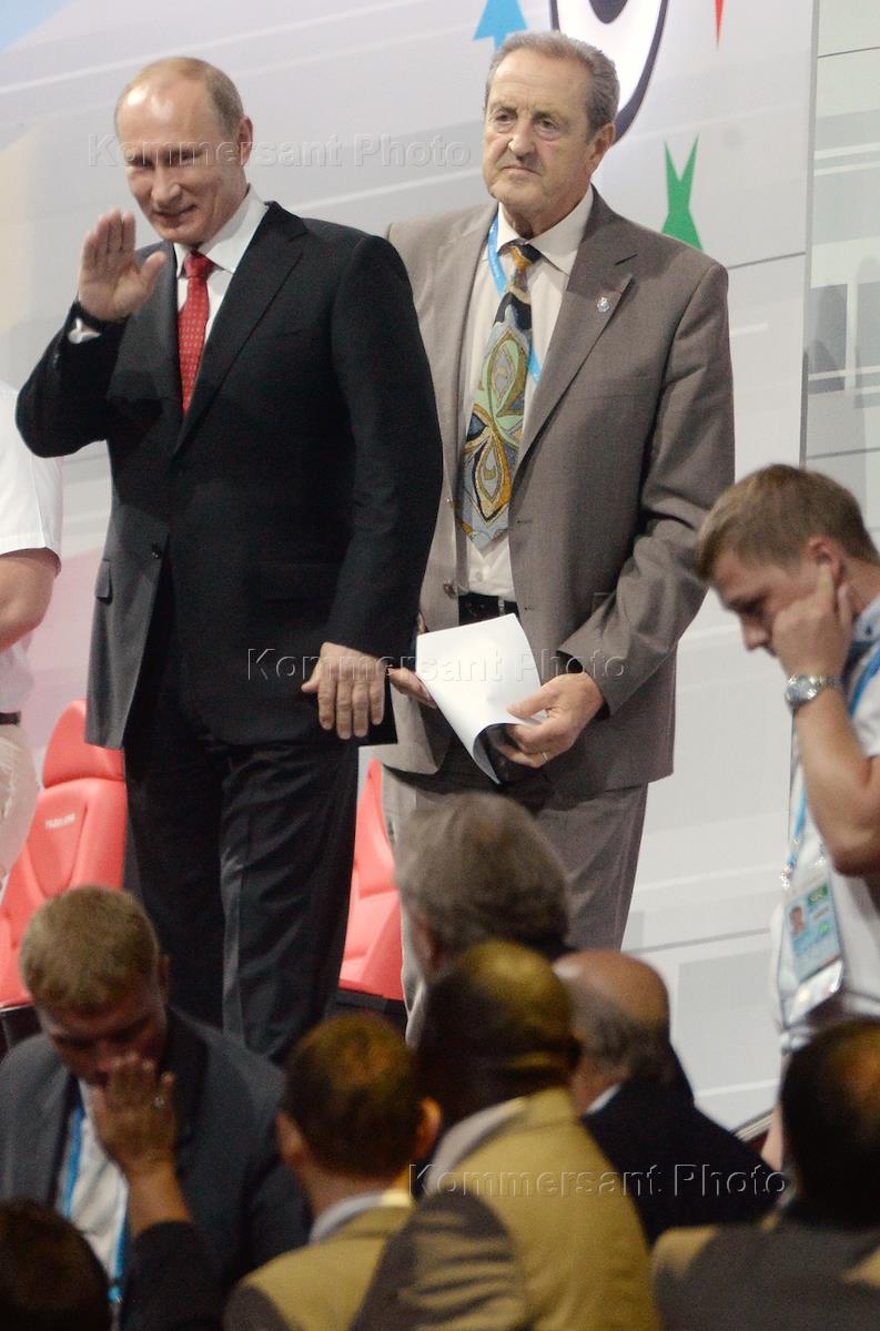 Президент Международной федерации студенческого спорта (ФИСУ) Клод-Луи Галльен (слева) и президент России Владимир Путин (справа) на церемонии открытия XXVII Всемирной летней Универсиады 2013 на стадионе "Казань Арена".