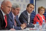 Слева направо: заместитель председателя Государственной думы (ГД) России, член комитета ГД по конституционному законодательству и государственному строительству Игорь Лебедев, первый заместитель председателя ГД России Иван Мельников, председатель ГД России Сергей Нарышкин и заместитель председателя ГД, член комитета ГД по труду, социальной политике и делам ветеранов Людмила Швецова на пресс-конференции, посвященной итогам весенней сессии Государственной думы России. Пресс-конференция прошла в пресс-центре ИТАР-ТАСС.