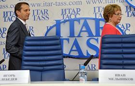 Слева направо: заместитель председателя Государственной думы (ГД) России, член комитета ГД по конституционному законодательству и государственному строительству Игорь Лебедев, первый заместитель председателя ГД России Иван Мельников и председатель ГД России Сергей Нарышкин на пресс-конференции, посвященной итогам весенней сессии Государственной думы России. Пресс-конференция прошла в пресс-центре ИТАР-ТАСС.
