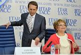 Председатель Государственной думы (ГД) России Сергей Нарышкин (слева) и заместитель председателя ГД, член комитета ГД по труду, социальной политике и делам ветеранов Людмила Швецова (справа) на пресс-конференции, посвященной итогам весенней сессии Государственной думы России. Пресс-конференция прошла в пресс-центре ИТАР-ТАСС.
