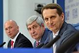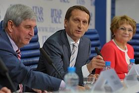 Слева направо: первый заместитель председателя Государственной думы (ГД) России Иван Мельников, председатель ГД России Сергей Нарышкин и заместитель председателя ГД, член комитета ГД по труду, социальной политике и делам ветеранов Людмила Швецова на пресс-конференции, посвященной итогам весенней сессии Государственной думы России. Пресс-конференция прошла в пресс-центре ИТАР-ТАСС.