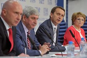 Слева направо: заместитель председателя Государственной думы (ГД) России, член комитета ГД по конституционному законодательству и государственному строительству Игорь Лебедев, первый заместитель председателя ГД России Иван Мельников, председатель ГД России Сергей Нарышкин и заместитель председателя ГД, член комитета ГД по труду, социальной политике и делам ветеранов Людмила Швецова на пресс-конференции, посвященной итогам весенней сессии Государственной думы России. Пресс-конференция прошла в пресс-центре ИТАР-ТАСС.
