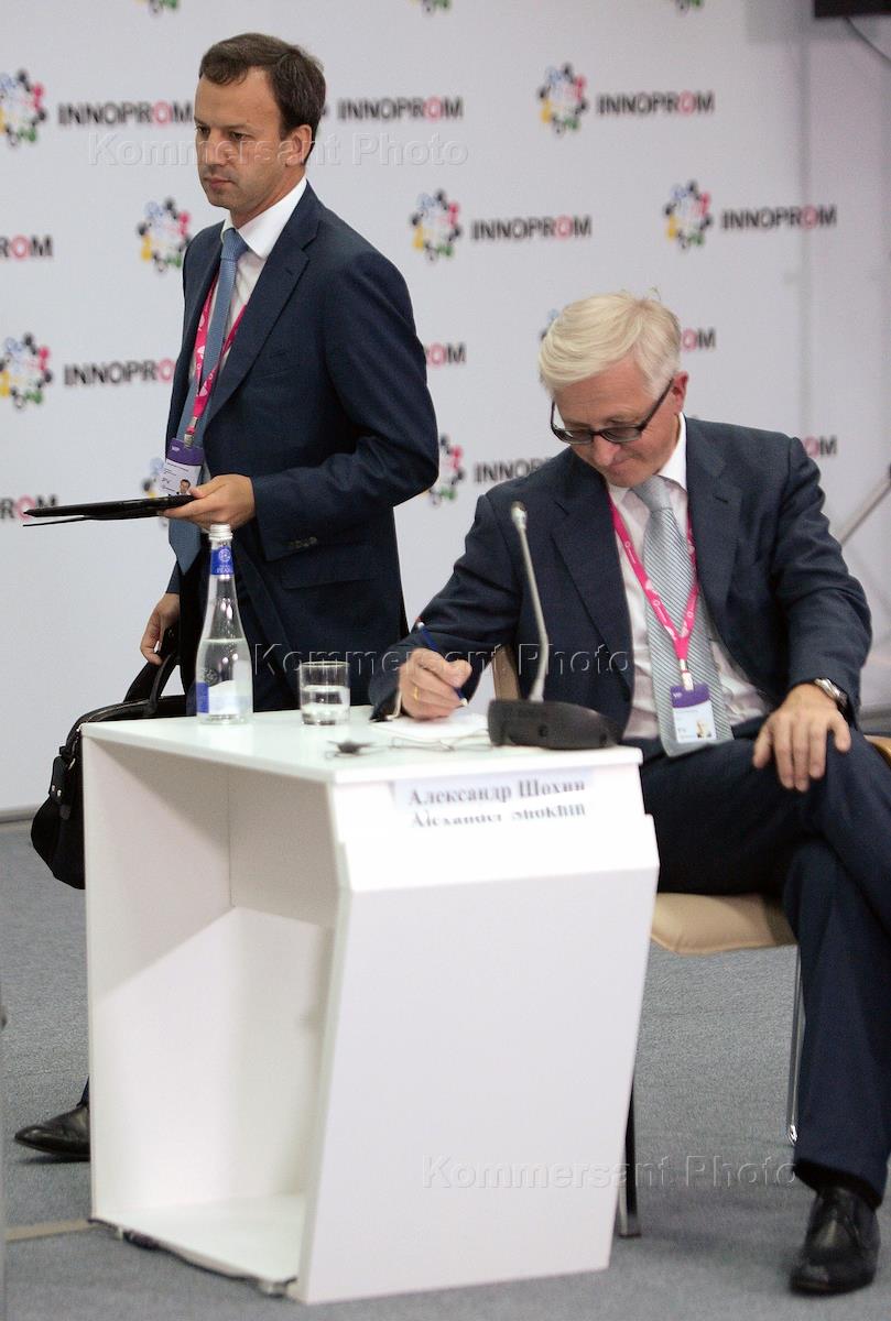 Рабочая поездка председателя правительства России Дмитрия Медведева в Екатеринбург. Заместитель председателя правительства России Аркадий Дворкович (слева) и президент Российского союза промышленников и предпринимателей Александр Шохин (справа) перед началом встречи председателя правительства России Дмитрия Медведева с представителями российских и международных деловых кругов в рамках Международной выставки и форума промышленности и инноваций "ИННОПРОМ-2013" в международном выставочном центре "Екатеринбург-Экспо".