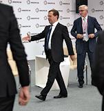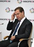 Рабочая поездка председателя правительства России Дмитрия Медведева в Екатеринбург. Председатель правительства России Дмитрий Медведев во время встречи с представителями российских и международных деловых кругов в рамках Международной выставки и форума промышленности и инноваций "ИННОПРОМ-2013" в международном выставочном центре "Екатеринбург-Экспо".