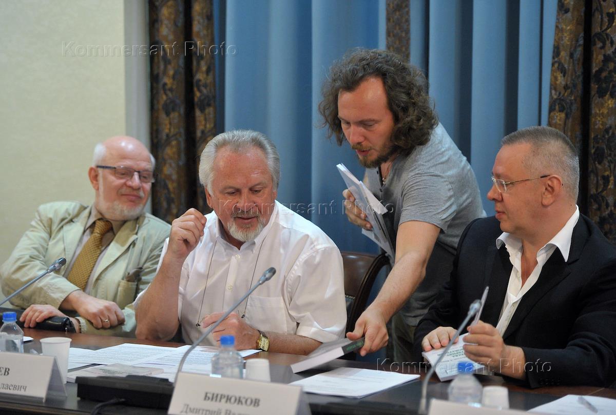 Слушания на тему: "Перспективы регулирования правоотношений в сети Интернет в Российской Федерации". Слева направо: председатель Совета при президенте России по развитию гражданского общества и правам человека Михаил Федотов, генеральный директор ЗАО "Редакция газеты "Московский комсомолец", главный редактор газеты "Московский комсомолец", председатель Союза журналистов Москвы Павел Гусев, заведующий кафедрой новых медиа и теорий коммуникации факультета журналистики МГУ им М.В. Ломоносова Иван Засурский и президент издательства "Семь Дней" Дмитрий Бирюков во время слушаний в Общественной палате России.