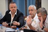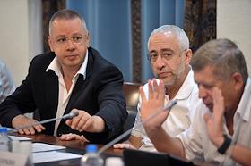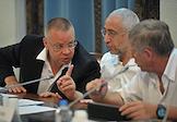 Президент издательства "Семь Дней" Дмитрий Бирюков (слева) и телеведущий Николай Сванидзе (в центре) во время слушаний на тему: "Перспективы регулирования правоотношений в сети Интернет в Российской Федерации". Слушания прошли в Общественной палате России.