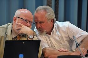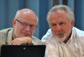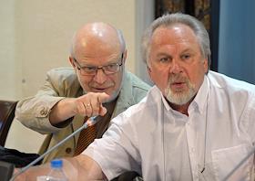 Председатель Совета при президенте России по развитию гражданского общества и правам человека Михаил Федотов (слева) и генеральный директор ЗАО "Редакция газеты "Московский комсомолец", главный редактор газеты "Московский комсомолец", председатель Союза журналистов Москвы Павел Гусев (справа) во время слушаний на тему: "Перспективы регулирования правоотношений в сети Интернет в Российской Федерации". Слушания прошли в Общественной палате России.