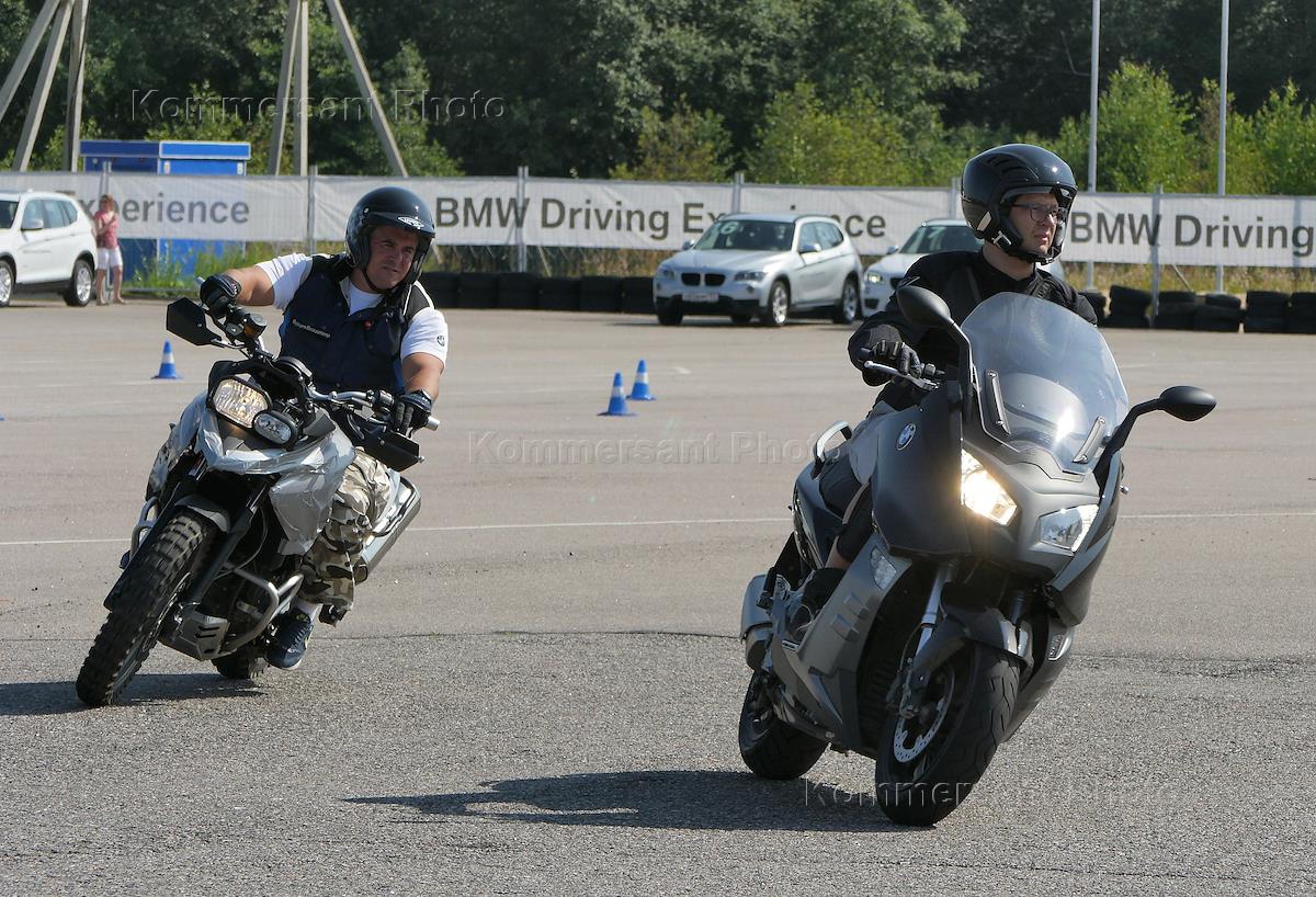 Главный редактор газеты "Коммерсантъ" Михаил Михайлин (справа) во время тест-драйва мотоцикла BMW на территории Центра водительского мастерства компании BMW на территории горнолыжного комплекса "Сорочаны".