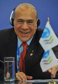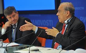 Генеральный секретарь Организации экономического сотрудничества и развития (ОЭСР) Анхель Гурриа во время пресс-конференции на тему: "МОТ и ОЭСР: обновленные данные о ситуации на рынках труда стран G 20". Пресс-конференция, приуроченная к совещанию министров труда стран Группы двадцати в Москве, прошла в РИА "Новости".