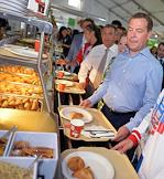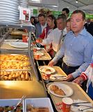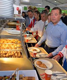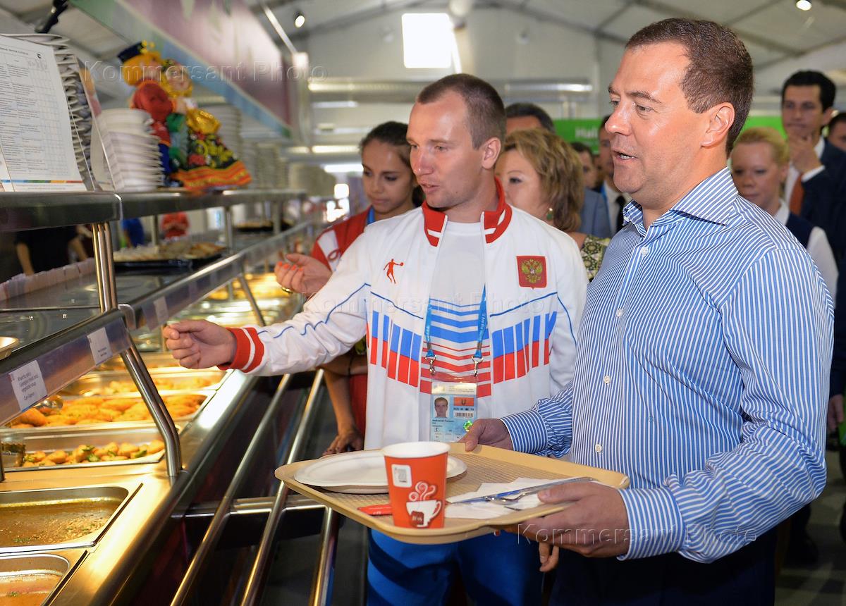 Рабочая поездка председателя правительства России Дмитрия Медведева в Казань. Председатель правительства России Дмитрий Медведев (справа) в ресторане для участников соревнований в деревне Всемирной летней Универсиады.