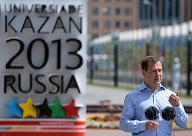 Рабочая поездка председателя правительства России Дмитрия Медведева в Казань. Председатель правительства России Дмитрий Медведев на аллее деревни Всемирной летней Универсиады.