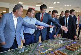 Рабочая поездка председателя правительства России Дмитрия Медведева в Казань. Слева направо: министр спорта России Виталий Мутко, председатель правительства России Дмитрий Медведев, мэр Деревни Универсиады Фарид Абдулганов и мэр Казани Ильсур Метшин у макета Деревни Всемирной летней Универсиады.