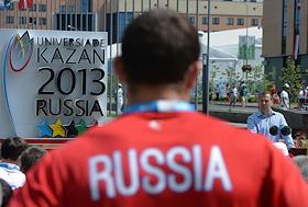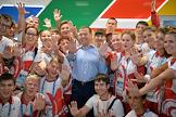 Рабочая поездка председателя правительства России Дмитрия Медведева в Казань. Председатель правительства России Дмитрий Медведев (справа) во время встречи с российской командой на аллее деревни Всемирной летней Универсиады.