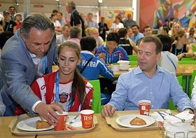 Рабочая поездка председателя правительства России Дмитрия Медведева в Казань. Слева направо: министр спорта России Виталий Мутко, член сборной команды России по художественной гимнастике Маргарита Мамун и председатель правительства России Дмитрий Медведев в ресторане для участников соревнований в деревне Всемирной летней Универсиады.