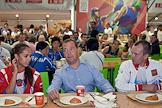 Рабочая поездка председателя правительства России Дмитрия Медведева в Казань. Председатель правительства России Дмитрий Медведев (в центре) в ресторане для участников соревнований в деревне Всемирной летней Универсиады.